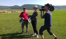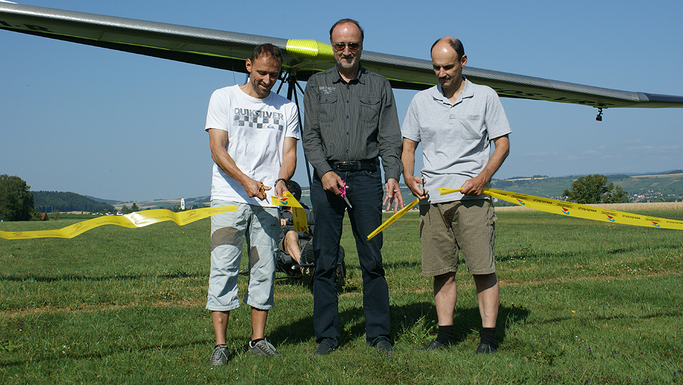 antrieb fliegen. Toni Roth wartet mit seinem ATOS-Trike auf den 1. Take-off. Die massgeblichen Akteure der UL-Lockerung brechen symbo-