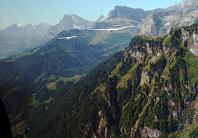 | Der Take-Off klappte problemlos | Pilot Walter Elmer mit viel Cockpit im Remos | Ecolight-Schleppzug in den Glarner Alpen | ||||||||||||