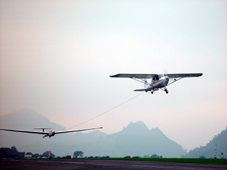 | Bereits am 17. Oktober 2003 erteilte das BAZL dem Ikarus C42 mit der Immatrikulation D-MLWC eine Hersteller-Sonderbewilligung nach erfolgreicher technischer Abnahme auf dem Flugplatz Buochs. Am 18. Oktober 2003 war es dann soweit: Erster Segelflugzeugschlepp mit dem Ikarus C42, welcher mit einem 100 PS-starken Rotax 912S-Motor ausgerüstet ist. Dank etwas Wettergeduld, der Nebel über Buochs hat sich erst gegen Abend genügend gelichtet, konnten verschiedene Flüge mit extremen Fluglagen und Schlepps bis auf 2500m/MSL gemacht und dokumentiert werden. Verschiedene Pi- loten der SG Nidwalden und der SG Oberaargau konnten mit der C42 als Schlepper vertraut gemacht werden. Der C42 war im Schlepp auch auf Volten- höhe kaum hörbar. Die Leistungen lagen im Bereich der bisher üblichen 180 PS-Schlepper. Die Flugeigenschaften des Schleppzugs sind eindeutig harmloser, der Segelflugzeugpilot darf grössere Fehler machen und kann das Schleppflugzeug kaum in eine kritische Fluglage bringen. |